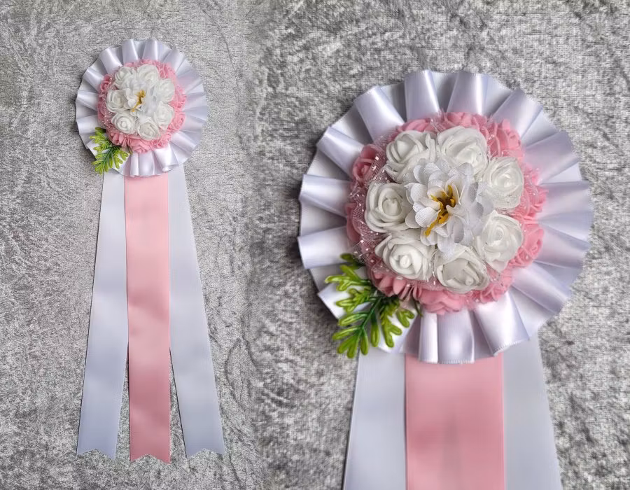 Rosetten levereras i de färger du ser på bilden, Vit, rosa. Du kan välja tryck på mittenbandet vilket ingår i priset.