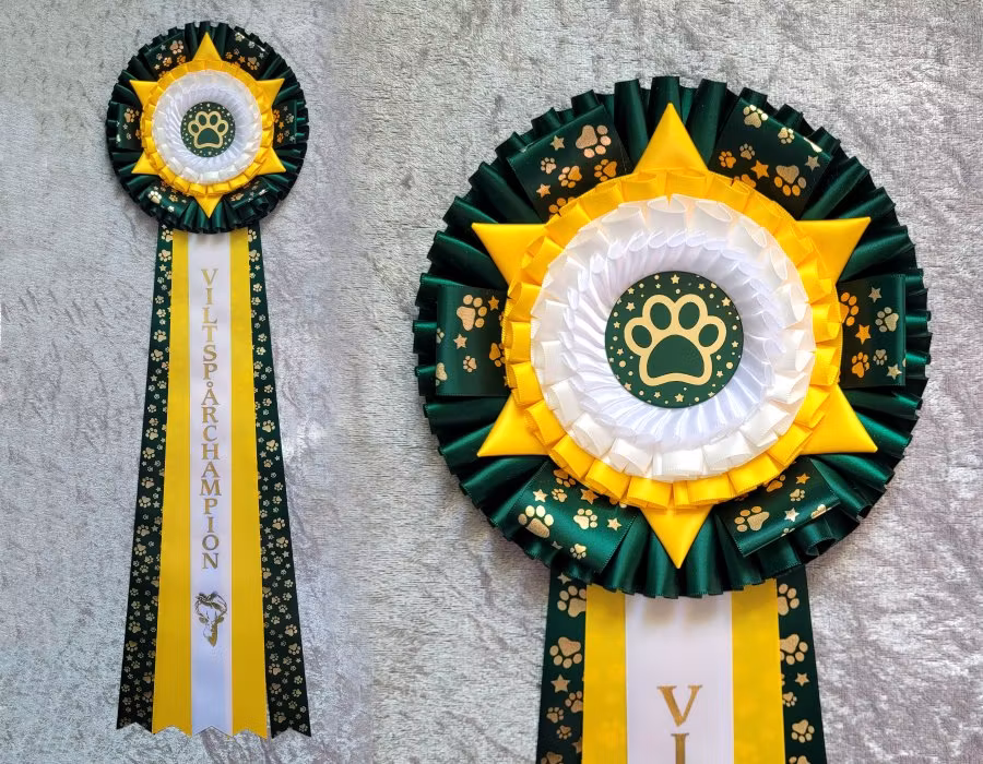 Diameter huvud: 18cm. Total längd: 65cm. Färger: Bonsai(03) + Gul (58) + Vit (53). Bandtryck: Viltspårchampion Centertryck: Tass